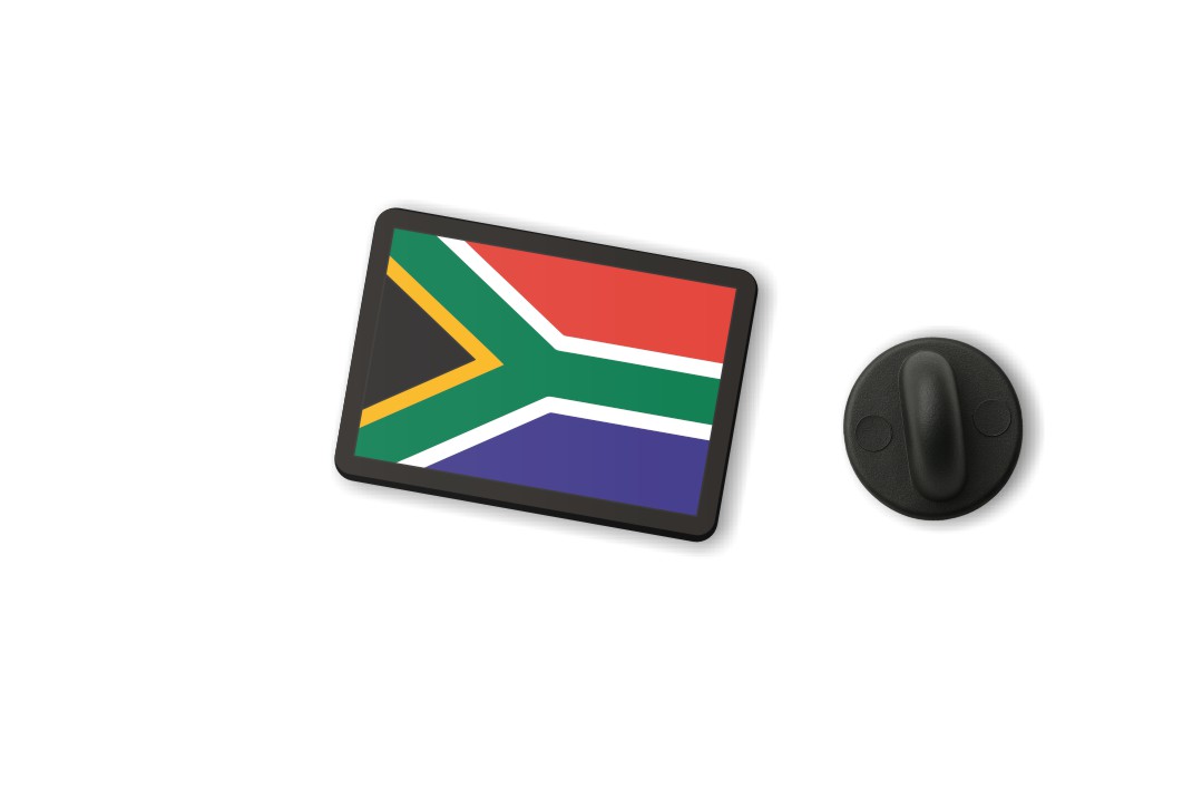 Współczesna flaga Republiki Południowej Afryki wyróżnia się charakterystycznym układem kolorów w kształcie poziomego „Y”. Od lewej strony biegnie zielony pas rozchodzący się na boki, otoczony wąską białą linią od góry i żółtą od dołu. Górne pole flagi wypełnia czerwień, dolne – niebieski, natomiast po stronie masztu widoczne jest czarne pole w trójkątnym kształcie. Ten układ barw dobrze odwzorowuje prezentowana przypinka, dzięki czemu znaczek jest łatwo rozpoznawalny i zgodny z aktualnym wzorem flagi państwowej RPA.